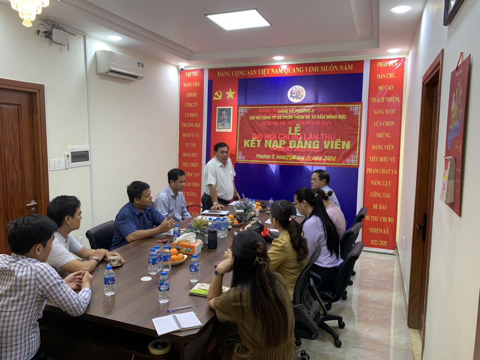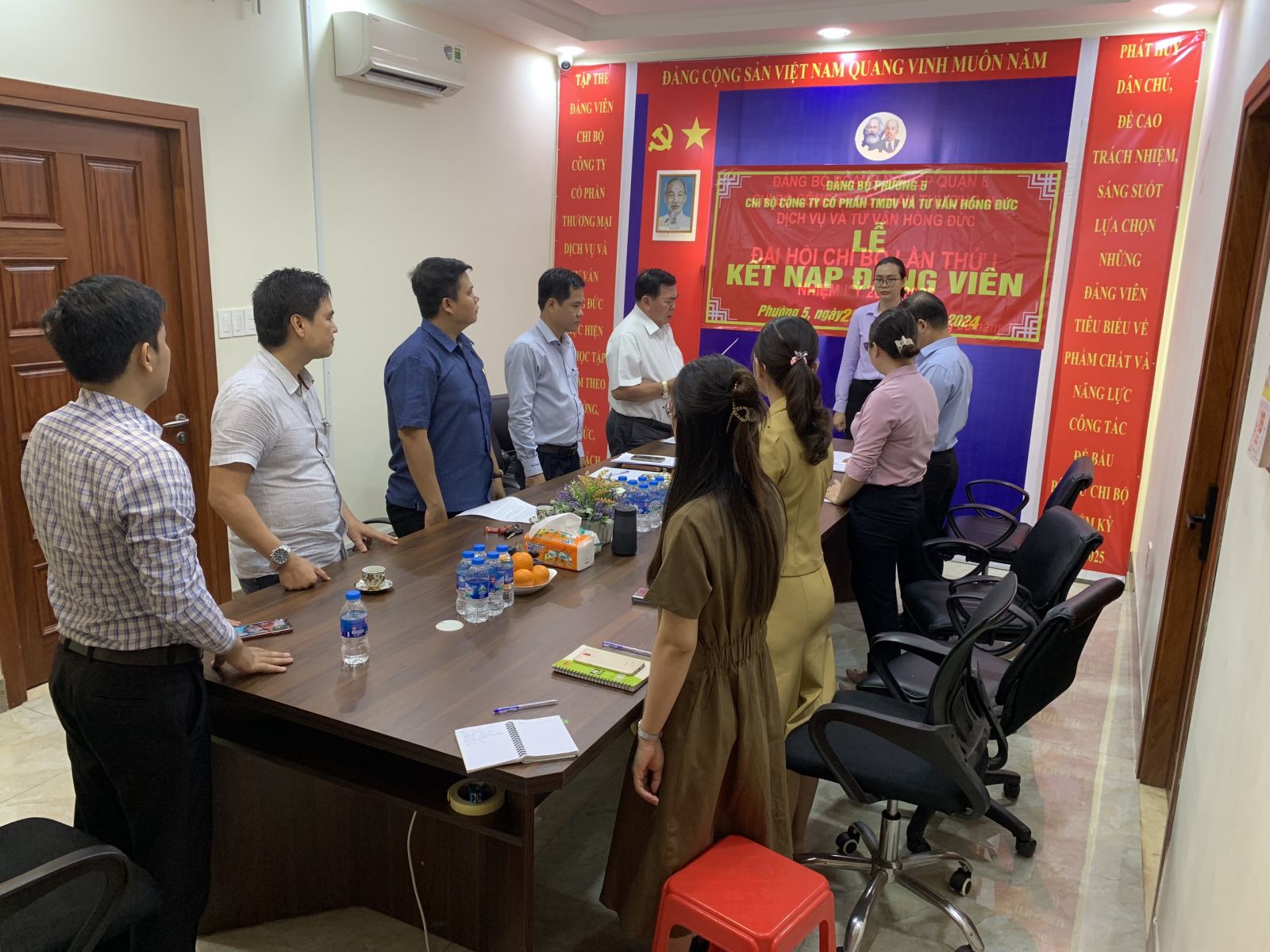 Trong không khí cả nước hân hoan tổ chức nhiều hoạt động chào mừng kỷ niệm 134 năm Ngày sinh của Chủ tịch Hồ Chí Minh ngày 19/5/2024, thực hiện Quyết định số 2909 – QĐ/QU ngày 17/05/2024 của Ban Thường vụ Quận ủy Quận 8 về việc kết nạp Đảng viên mới cho quần chúng TRẦN TRƯƠNG HÀ THANH, Ngày 25/05/2024 Chi bộ Công ty Cổ phần TMDV và Tư vấn Hồng Đức đã tổ chức lễ kết nạp đảng viên mới cho quần chúng TRẦN TRƯƠNG HÀ THANH.